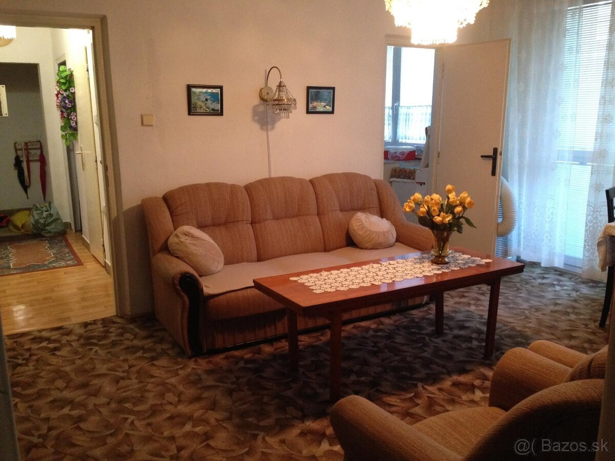 Byt sa nachádza na 6.poschodí z 10. Byt je v zachovalom pôvodnom stave, o výmere 74 m2, má vymenené plastové okná. V byte sa nachádza kumbál a k bytu prislúcha pivnica na prízemí panelového domu. Byt je orientovaný juhovýchodne a je kompletne zariadený funkčným nábytkom vrátane chladničky, práčky a sporáku s rúrou , možnosť okamžitého bývania .